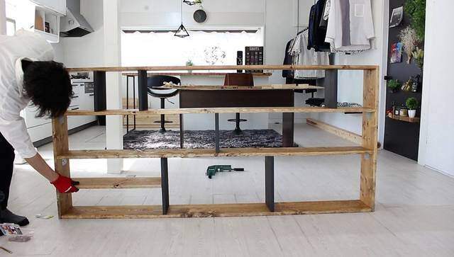 ダークウォルナットの一色だけだと寂しい感じがするので、差し色でアイアンペイントで塗装した仕切りを取り付けます。棚を支える役割も担うのでアイアンっぽく見えてよいかなと思いました。
