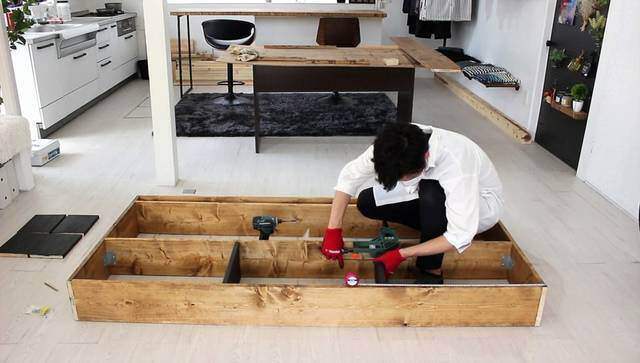 この時、下段は330mm、上段は230mmの設計で作っているので、段が狭くてインパクトドライバーが入りません。1段ずつビス止めしていきたいと思います。
