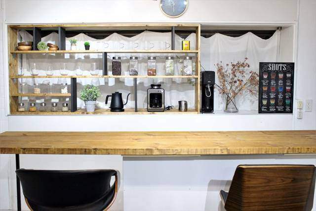 コーヒーメーカーやポットなどの家電も、奥行き180mmある1×8材を使っているので余裕を持って置くことができます。