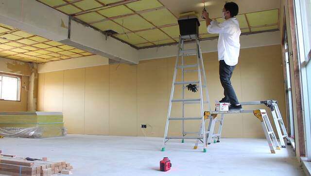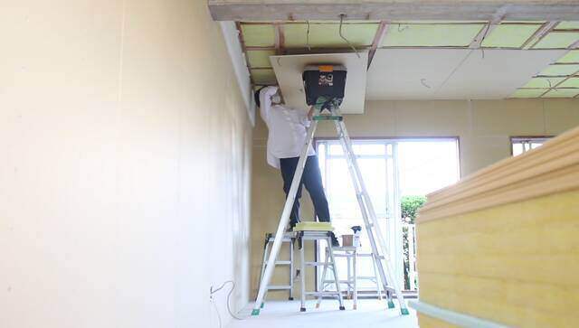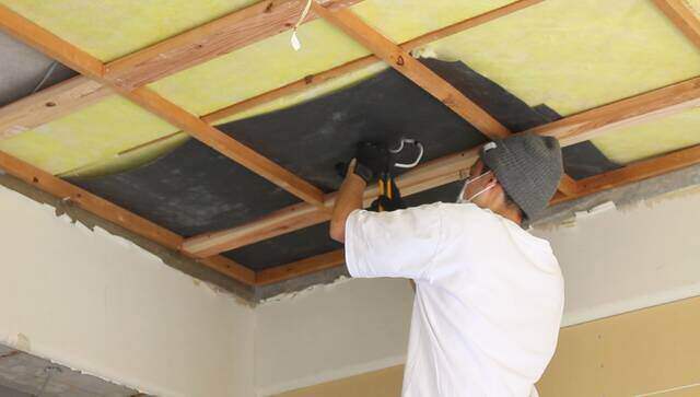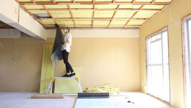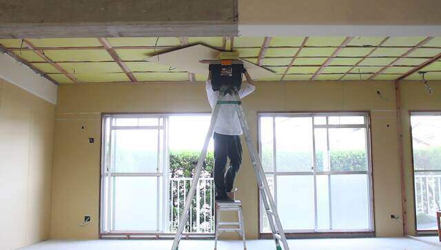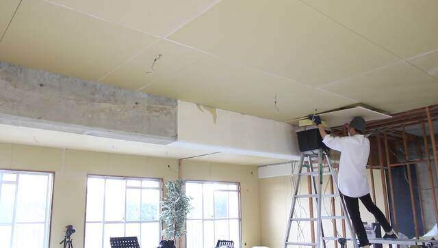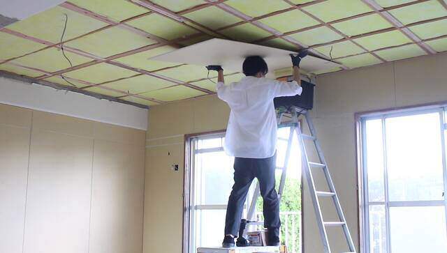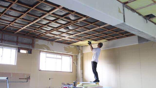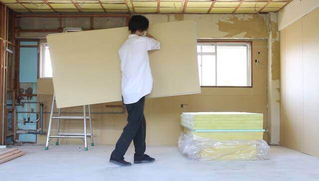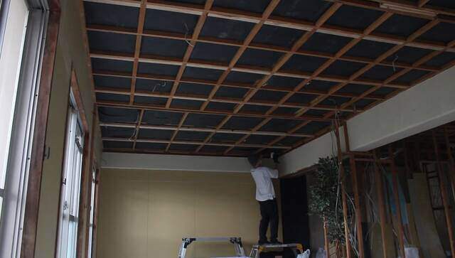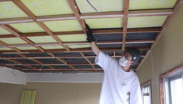 この作業を繰り返し、全ての天井を石膏ボードで埋めたら防音天井の完成です。