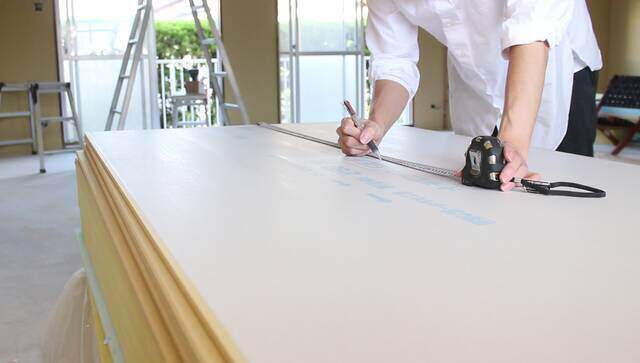 照明配線がある位置の石膏ボードには、事前に距離を測って配線を通す穴を開けておきます。
