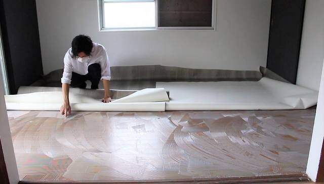 接着剤を塗って、床にアッシュグレインのクッションフロアを貼る