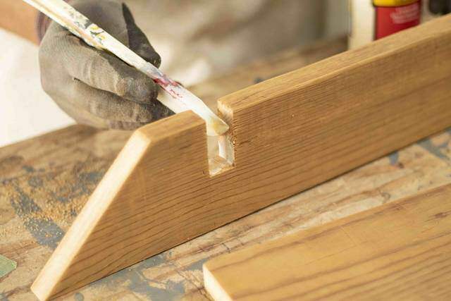 うまくハマったら、木工ボンドを塗って脚と幕板が外れないように強度を高めておきましょう。