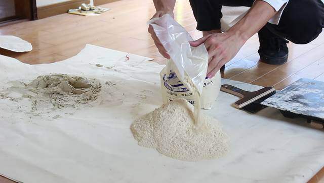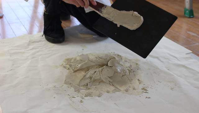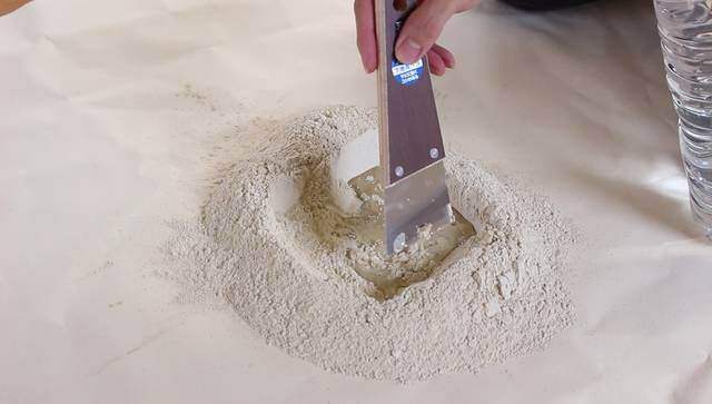上塗り用パテも下塗り用パテと同様で、500mlほどの水を少しずつ混ぜながら練り合わせます。