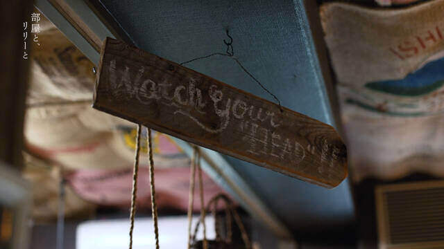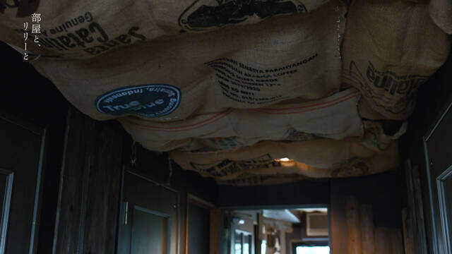 リリーさんの学生時代にも流行っていたという珈琲の麻袋。天井のカゴも少しだけ残されています。