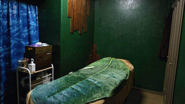 こちらはサロンスペース。ダークグリーンの壁と魚のカーテン。南国の雰囲気の中でリラクゼーションを受けられます。