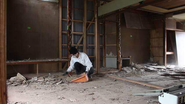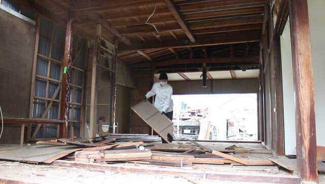 3台ある収集車の1つに砂壁を積み込み、もう2台の方にその他諸々を積み込み分別しながら廃棄します。「てみ」いっぱいに集めた砂壁の破片を収集車に放り投げ、ひたすら家と車の往復。