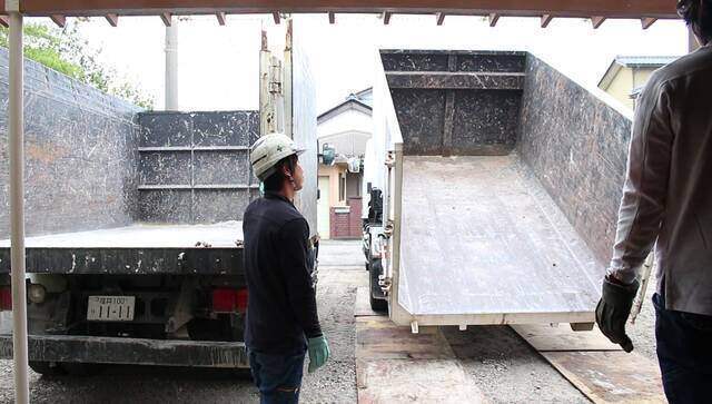 ある程度解体が進んだら収集車が到着しました。分別していた木材、鉄類、砂壁、石膏ボードをそれぞれの車に積み込みます。