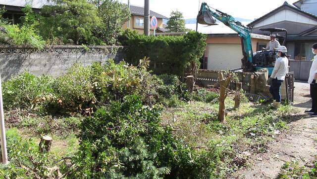 太い木は人力では無理なので、油圧ショベルの先で引っこ抜きます。