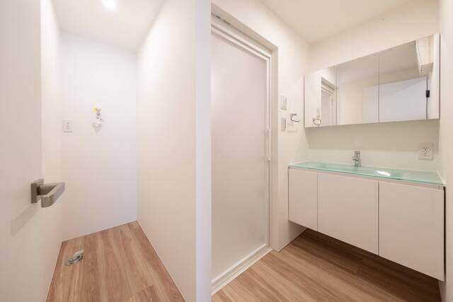 こちらはGT洗面台を採用した事例です。ミラーキャビネットの収納力のおかげで、ごちゃごちゃしがちな洗面台をすっきりと保つことができます。真っ白な空間に馴染みがよく、ガラスのボウルがすっきりと清潔感を演出しています。
