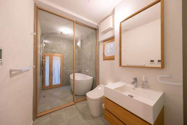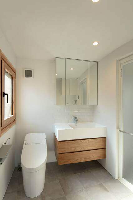 上の写真はIT化粧台を使用した事例です。バスルームとお手洗いの仕切り部分とミラーとキャビネットの木目トーンを合わせることによって、空間に統一感が生み出されています。