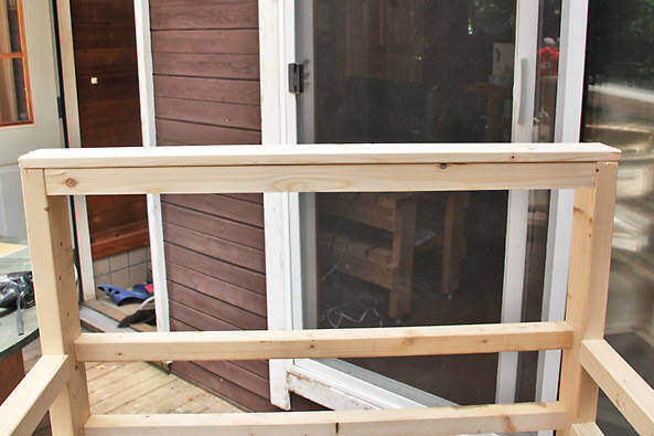 2×2材で、前後の骨組みをつなげば骨組みが完成。なお、前後の脚をつなぐ際に、板の厚み(89mm)でビスが届かないので、10mm径ドリルビットで穴あけしてから(座グリという)ビス留めしましょう。できればあけた穴はビス留め後、10mm径の丸棒で塞いだ方が見栄えがよくなります。