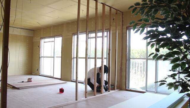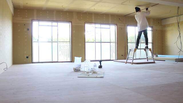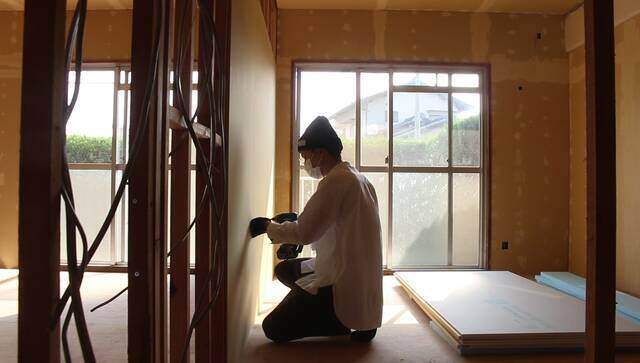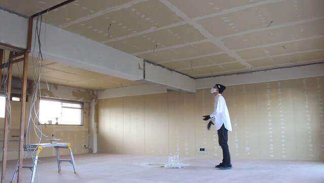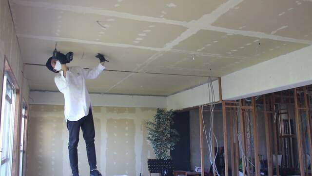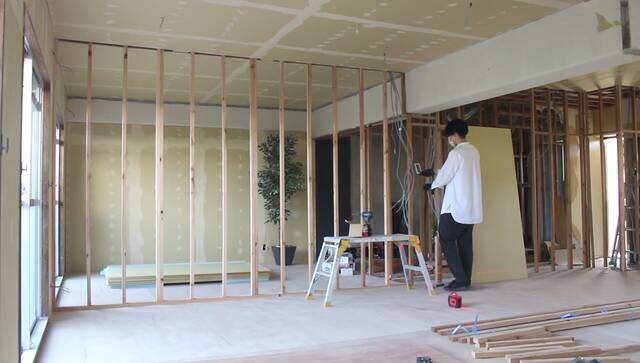 今回はリビングキッチンと寝室を区切る壁を作り、壁と天井にパテを塗る作業です。