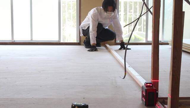レーザー墨出し器を使って真っ直ぐなっているか確認した所、木材がたわんでいて、置いた状態だと弧を描くようになります。(木の端がレーザー上に来てほしいのですが微妙にズレている)
