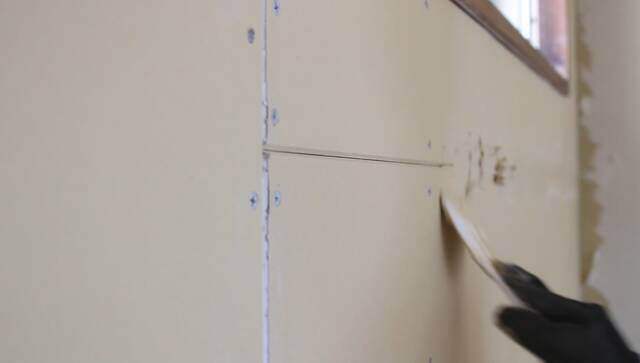 石膏ボードのつなぎ目は斜めに面取りして、パテが入りやすいようにしています。