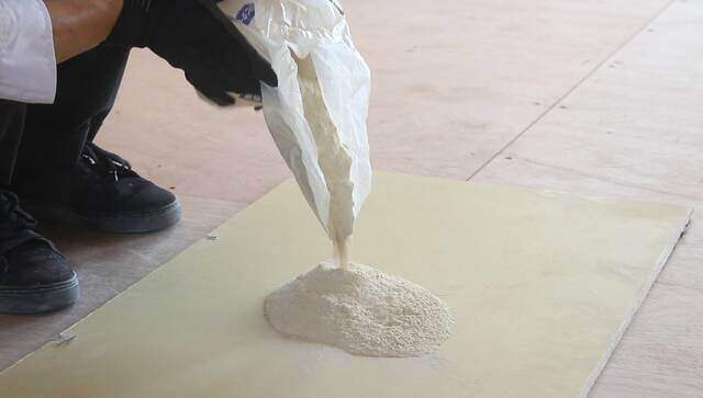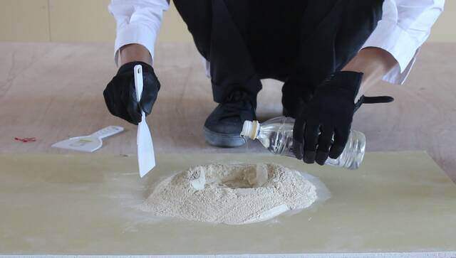 粉末パテの真ん中を窪ませて土手を作り、水を少量入れながら粉と混ぜ固めていきます。(水はパテ1㎏に対して500mlです)