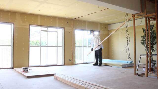 このタイミングで、木材の間に防音材や遮音材、断熱材などを入れる方は入れてください。