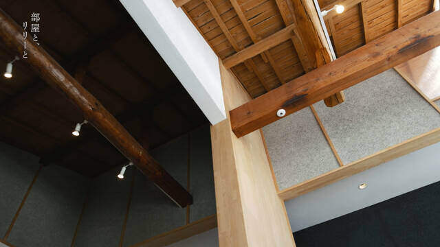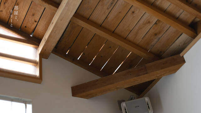天井が高くて開放的なお家です。古い梁も良いアクセントになっています。左に見える梁には、スポットライトを取り付けて照明として使われているようです。