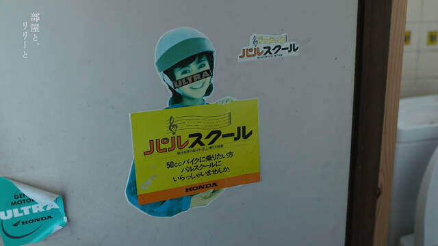 トイレの扉にはレトロなステッカーが。ホンダのバイク法令&乗り方教室「パルスクール」のものらしいです。