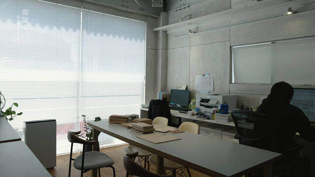事務所内は合板に白のペンキを塗っただけのシンプルな造り。