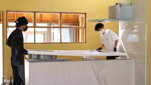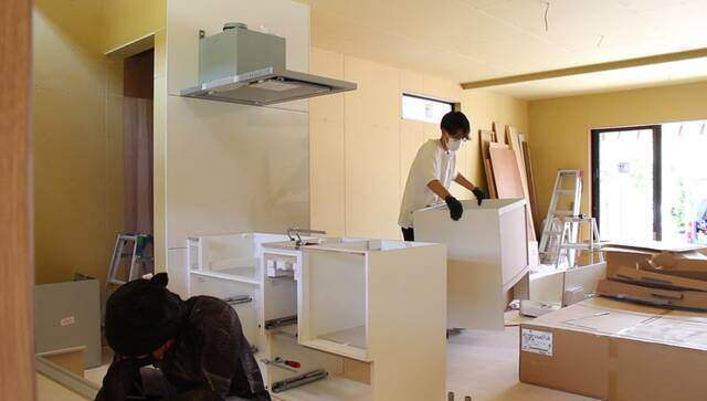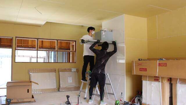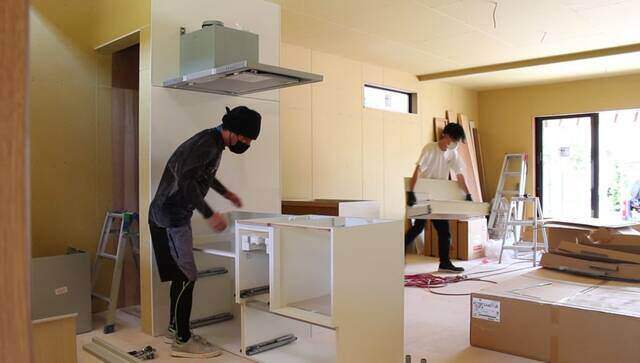 換気扇の取り付けが終わったらキッチンの取り付けに移ります。
