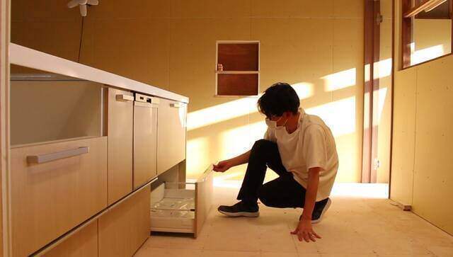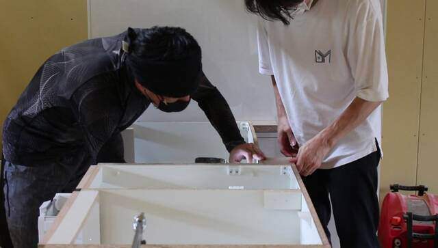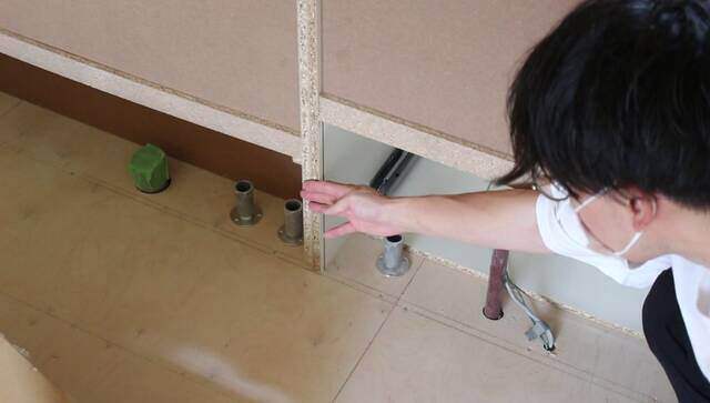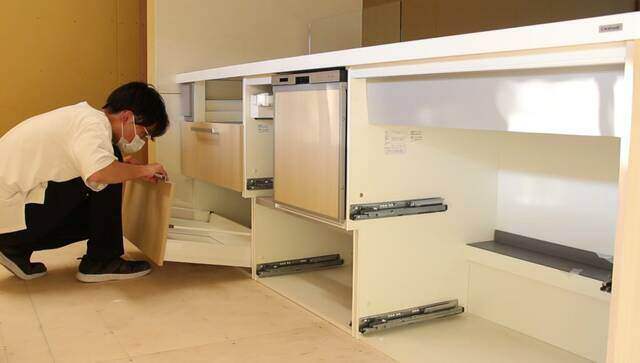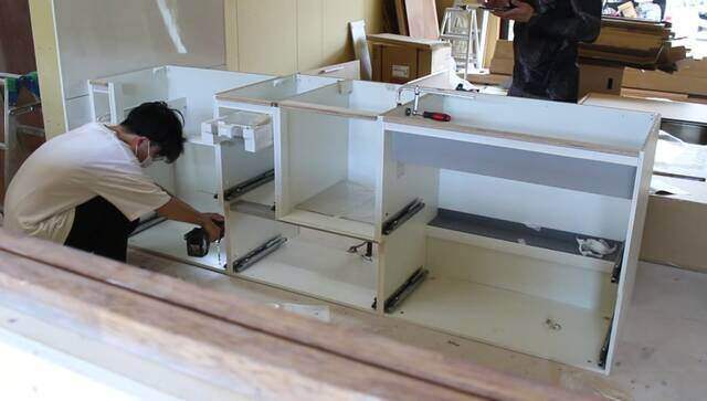 キッチンは「コンロ」「食洗器」「流し台」の3つに分割されているので、それぞれの土台を1つに繋ぎ合わせて取り付けます。