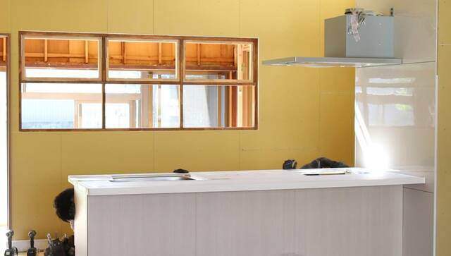 キッチンの背面は引き出しと同じ色のボードを取り付けます。