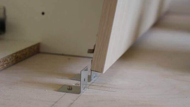 寄り掛かった時などにキッチンが動かないよう土台と壁際も固定します。