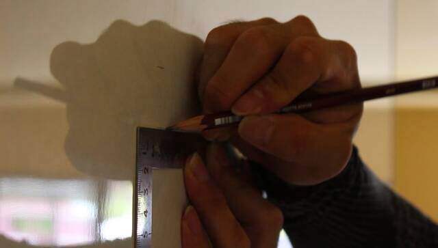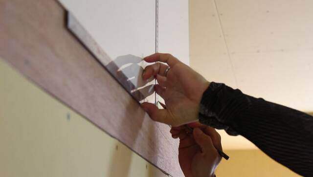 キッチンの背面に合わせて換気扇を取り付けたいので、キッチンパネルにも線を引いて基準を作ります。