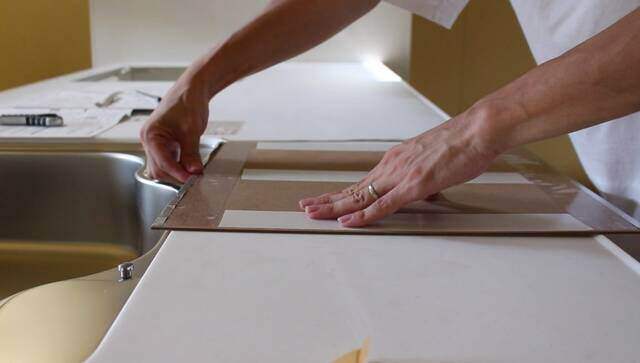 キッチンパネル縦一枚で貼れれば楽でしたが、横幅が足りなかったので3枚のキッチンパネルを使うことにしました。勿体ないですが3分割して貼ります。