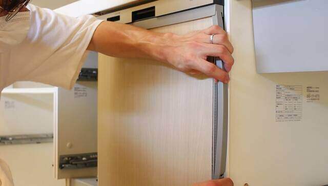 木目の向きを引き出しに合わせて食洗器に取り付けます。