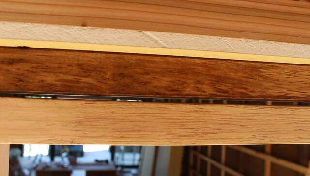 キッチン後ろのカップボード上に6個の窓が来る想定で、ガラスをはめ込めるように溝を掘ったゴムの木の集成材を取り付けます。