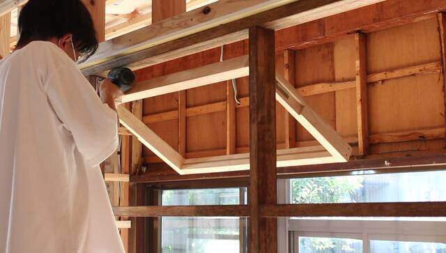大工さんが枠を組み立て、私が枠を塗装し一緒に取り付けていきます。