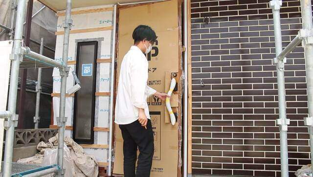 (玄関ドアの下に入れるパッキンについて説明を受けています。)