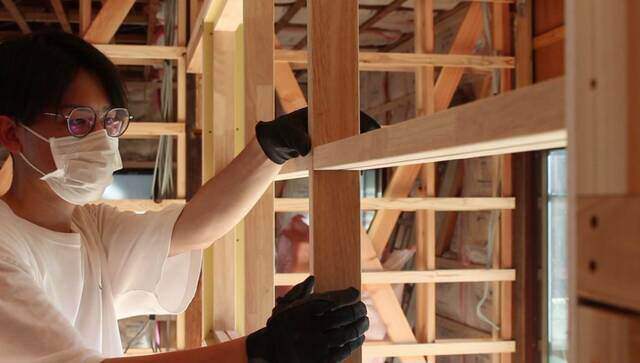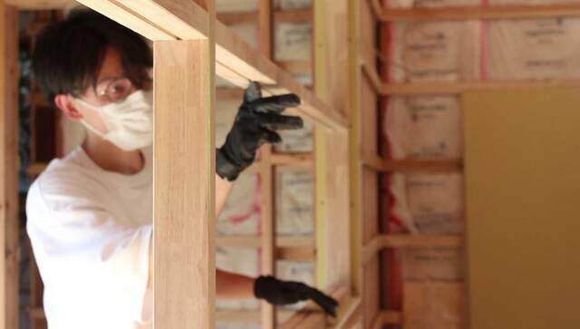 ドアとドア横に取り付ける窓枠に合わせて間柱を組み立てます。