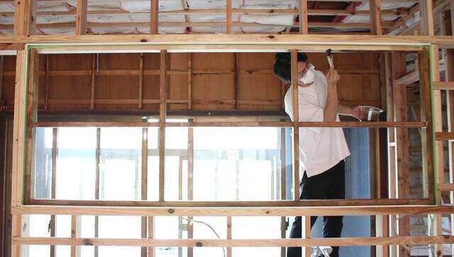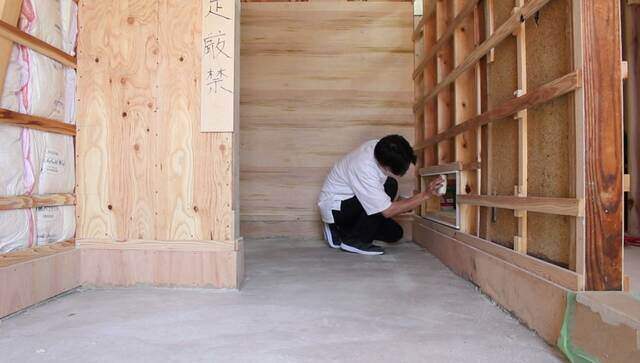 前回は壁の下地を作って断熱材を詰める所までの作業でした。今回は窓枠塗装と玄関取り付け作業です。