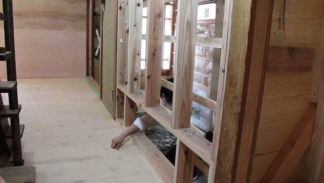 主に木製の小窓に使用するホイトコを使って上段窓は開閉できるようにします。