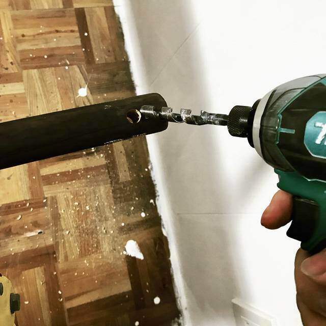 次に、買ってきた木材にヒモを通す穴をインパクトドライバーであけます。