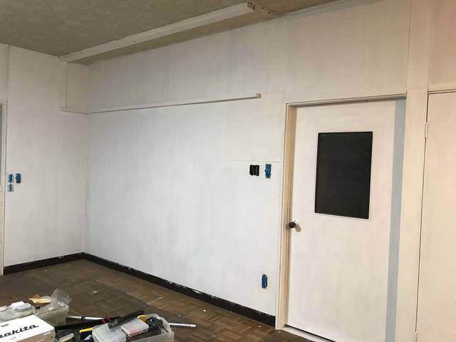 先ほど吊り下げ型ハンガーラックを設置した壁に、今度は棚を取り付けます。