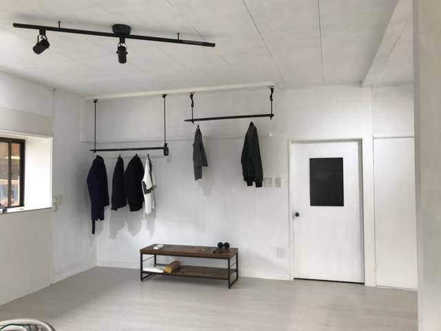 殺風景だった壁ですが、ハンガーラックと棚を設置したことにより、ショップのようなお洒落な雰囲気のスペースが出来上がりました。