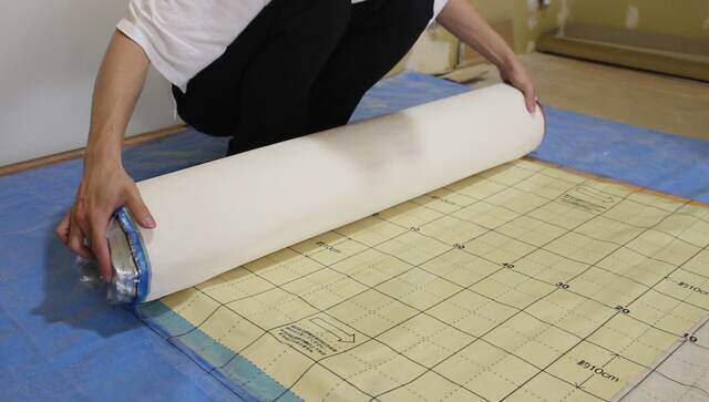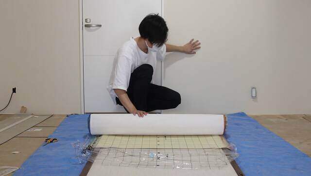 壁の長さより少し大き目にカットして保護シートを剥がしたら、ハケで空気を抜きながら壁に張り付けます。