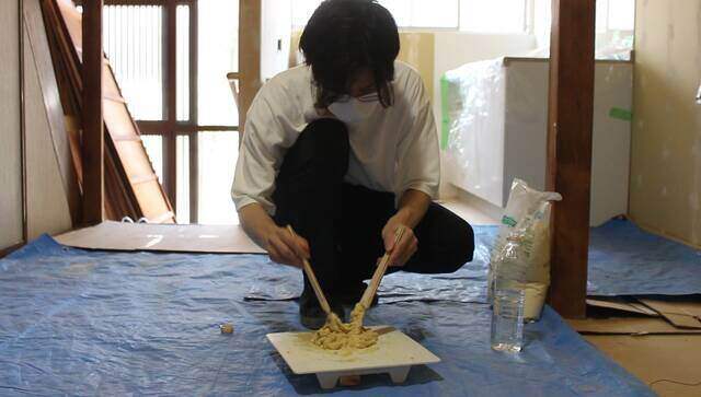コテ板の上に粉パテを山積みにし、くぼみ部分に水を流しながら固めていきます。
