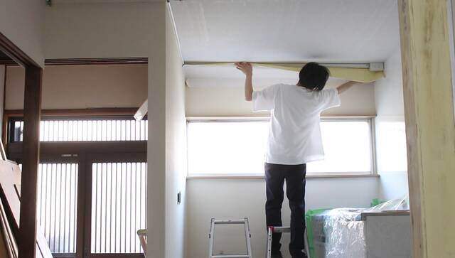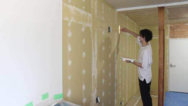 石膏ボードの繋ぎ目とビス穴、天井の繋ぎ目など凹凸がある箇所に下塗り用パテを処理し終えたので、2回目に上塗り用パテで綺麗に仕上げます。