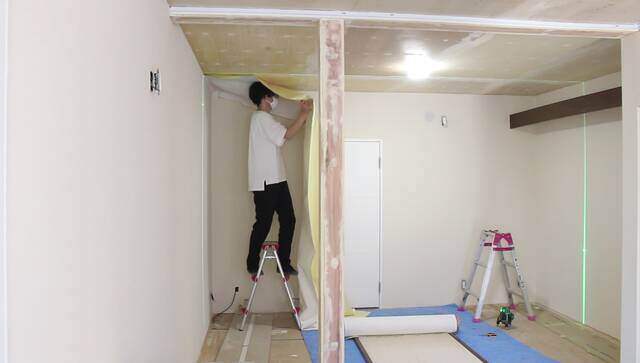 真っ直ぐになるようレーザー墨出し器を使いながら貼ります。