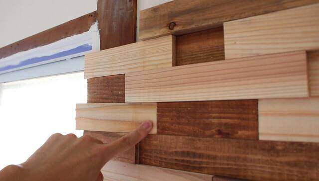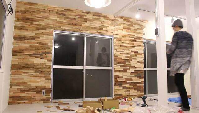 今回は壁一面に杉板を貼って立体的な壁を作る作業です。