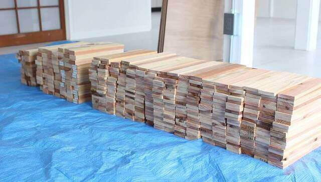 長さ1,000mmの杉板を250mmにカットしてもらい450個ほど準備した状態です。