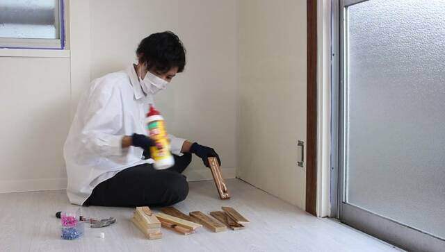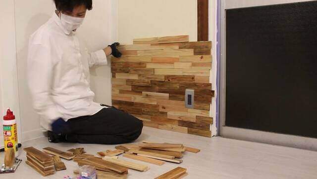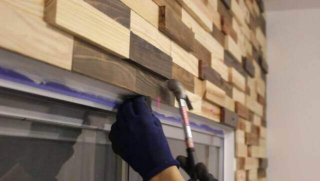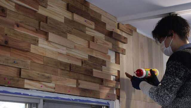 タッカーを使って固定したり、フローリングのように差し込みながら貼っていく方法など、壁一面に板を貼る方法はいろいろありますが、今回はボンドと隠し釘を使った方法を使います。