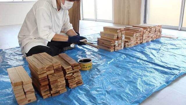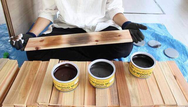用意した杉板1枚ずつにオールドウッドワックスを塗ります。