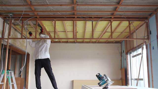 部屋を仕切っていた襖があった場所をまたぐように天井を張る形になるので、リビングと同じ向きに野縁を固定して仕上げていきます。