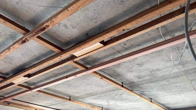 天井コンクリートに固定している吊り金具が当たるので、その部分に印をつけて削りキッチン側も同じように野縁を追加します。